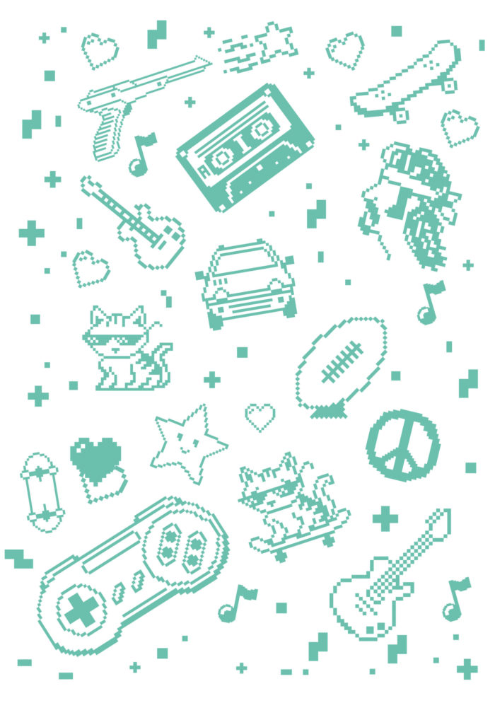 L’idée était simple : rendre hommage à la génération 80-90. J’ai conçu une série de pictogrammes et symboles inspirés des références cultes : jeux vidéo rétro, Tetris, Pac-Man, guitare électrique, coupe mulet, motifs colorés et clins d’œil geeks. Chaque élément se combine pour former une tapisserie graphique autour du verre, transformant chaque gorgée en voyage dans nos souvenirs d’enfance.
