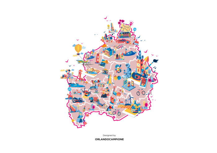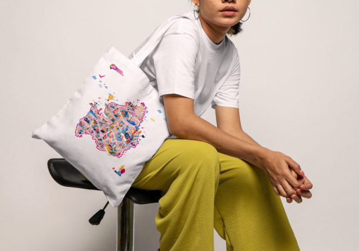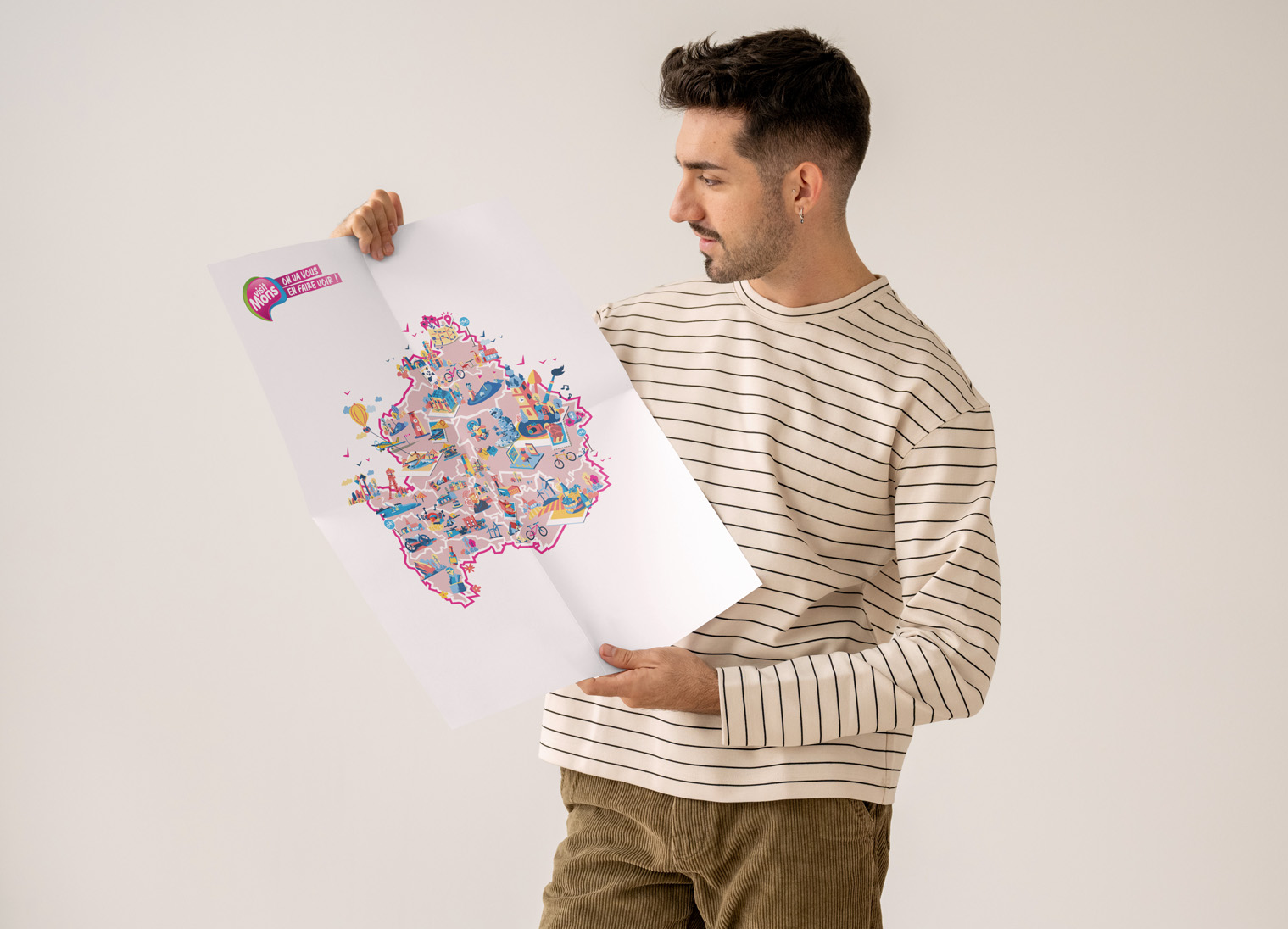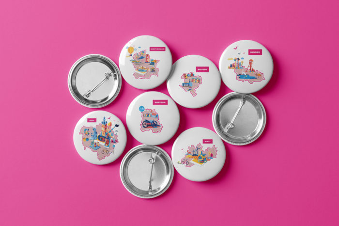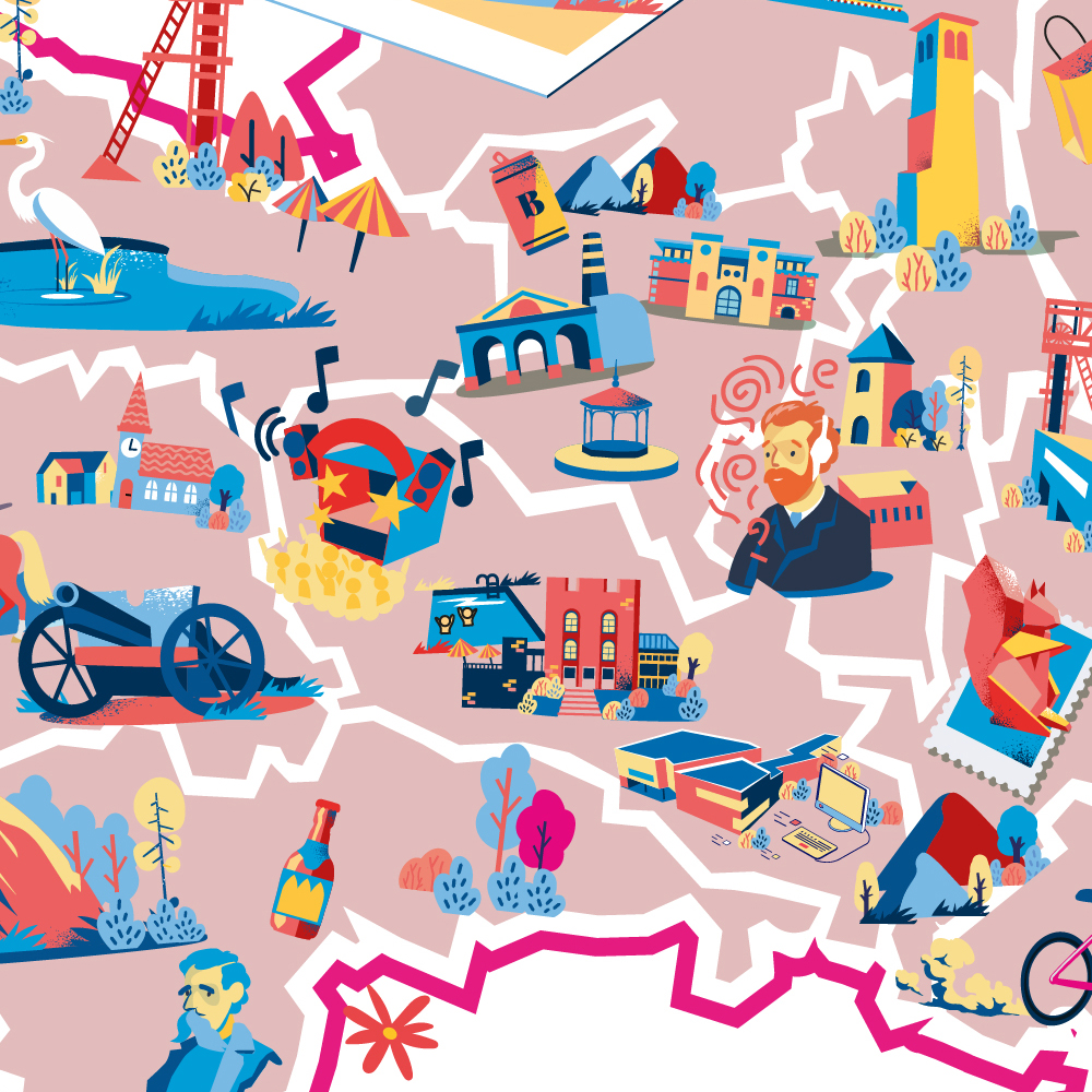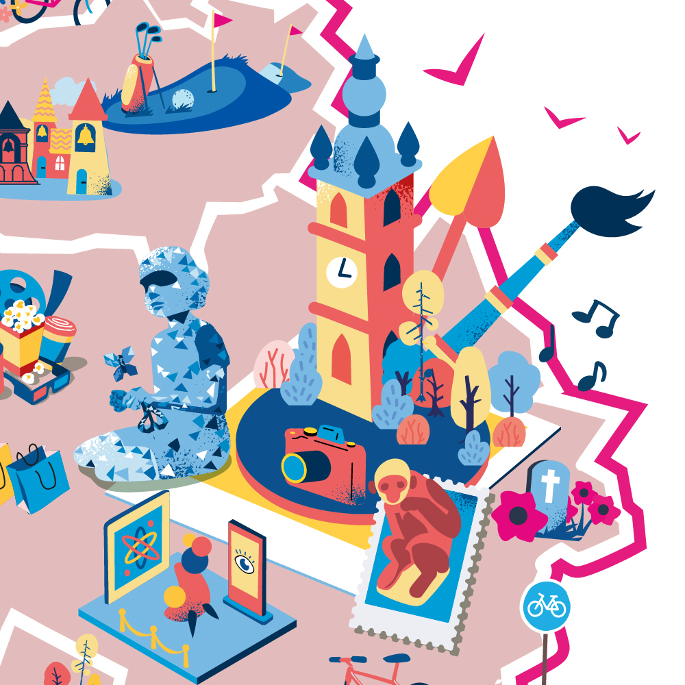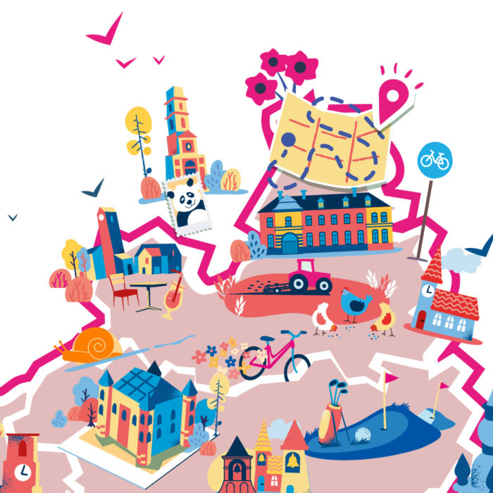 Ce projet d’illustration cartographique pour VisitMons a aussi été pensé pour une diffusion large : web, brochure, cartes postales, badges, tote bags ou t-shirts.