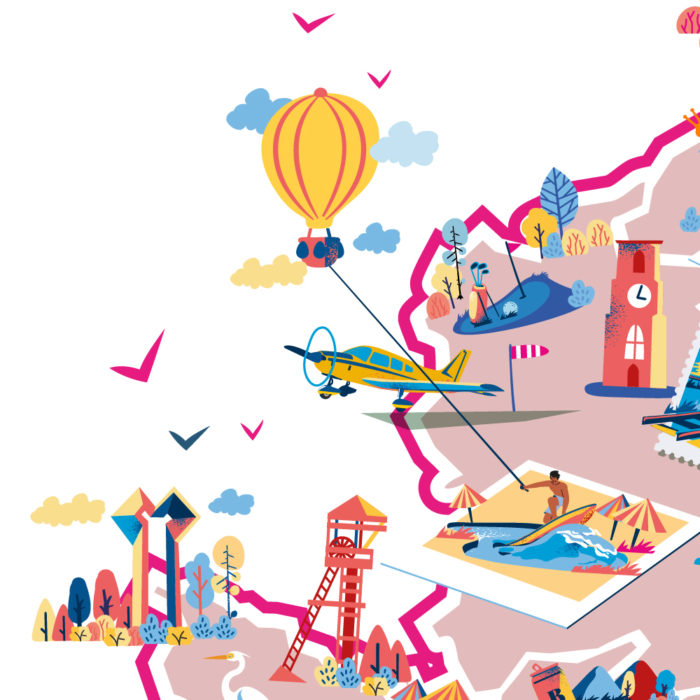 En collaboration avec JustLetMinot, j’ai développé un style d’illustrations graphiques minimaliste, clair et chaleureux. Les formes sont simples, les couleurs équilibrées, afin de rendre la carte facile à lire tout en conservant une vraie personnalité. Chaque commune trouve sa place, comme un chapitre d’une même histoire.