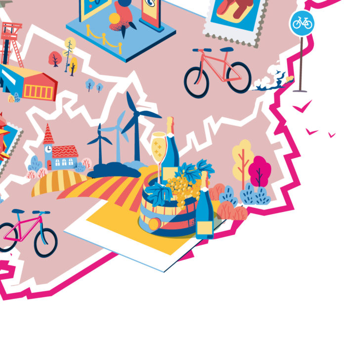 Pensée comme une carte interactive du Mons-Borinage, cette création met en lumière les 13 communes de la région. Chaque illustration repose sur un repère fort, immédiatement reconnaissable. Le beffroi de Mons, le Doudou montois, le MAC’s d’Hornu, le château de Boussu, l’aérodrome de Saint-Ghislain ou encore le rugby de Frameries deviennent des points d’ancrage visuels qui racontent l’identité locale.